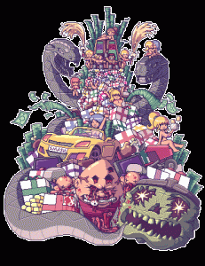 Sjå ellers 40 andre eksempel hos Noupe, og les ein kjempegod artikkel med mange fantastisk flotte eksempel i Smashing Magazine sin artikkel «Pixels Go Mad – The Celebration of Pixel Art«. Har du lyst å prøve deg på å lage noko liknande? Sjå PSDTuts for ein samling med tutorials, eksempel og andre ressursar for piksel-kunst.